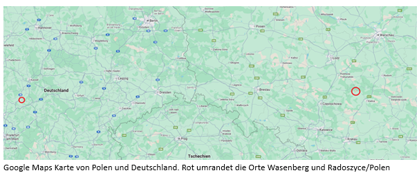 Meine Urgroßmutter hat vor dem Krieg in Polen geheitratet. Ihr Ehemann (Herr Relidzynski) ist 1939 verstorben. Meine Eltern erzählten mir die Geschichte, dass meine Urgroßmutter in Polen in der Kriegszeit Köchin für dort stationierte Soldaten war. Da Ihre Familie nicht genug zu essen hatte, hat meine Urgroßmutter von der Küche Essen für sie mitgenommen. Eines Tages haben die Soldaten das mitbekommen und sie hatte Todesangst vor einer Hinrichtung. Sie ist deswegen geflohen- nach Deutschland. Mein Urgroßvater (Jan Szambuski) und meine Urgroßmutter (Stanislawa Szamburska) kannten sich bereits vor dem Krieg. Wir vermuten, dass meine Urgroßmutter nicht zufällig den Fluchtort- Wasenberg gewählt hat.