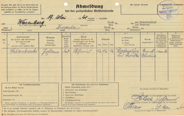 Werner fand den ersten Hinweis in Ottrau. Dort gab es eine Abmeldung des Bürgermeisteramtes vom 19. April 1941 für Johann Schamburski, ledig, Beruf Schreiner geb. am 12.12.1912 mit dem Hinweis auf den Ortswechsel nach Wasenberg.
